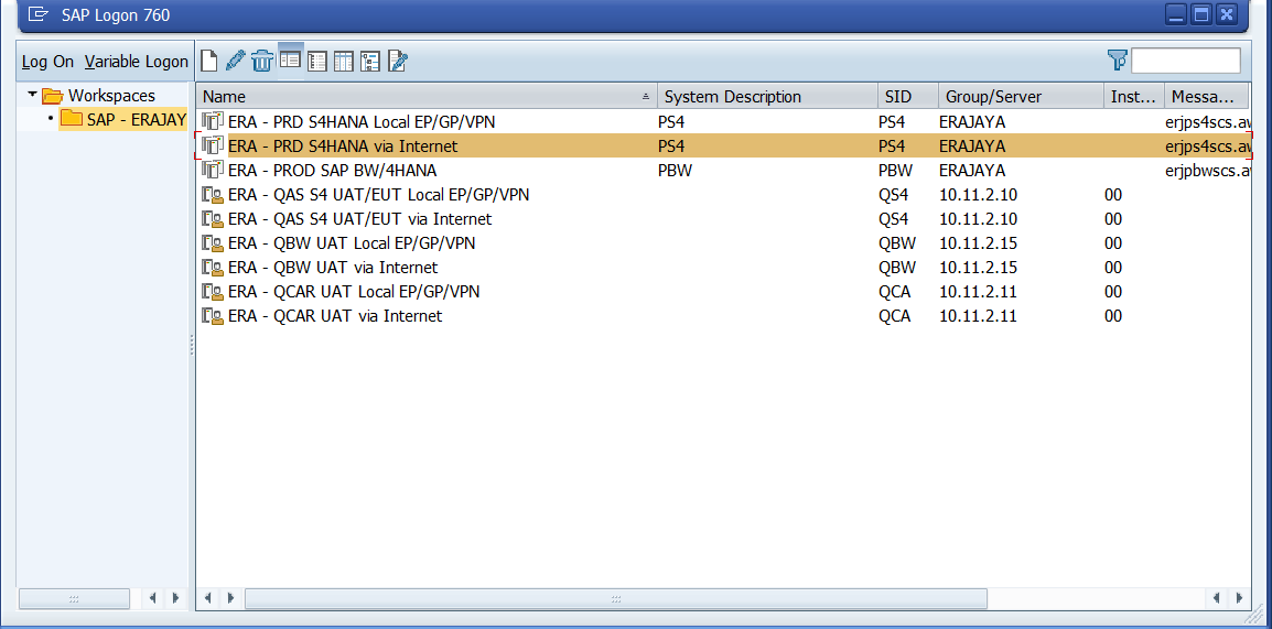 - Silahkan Buka SAP, dan pilih Pilihan Nomor 2 ERA - PRD S4HANA via Internet. Dan Masukkan Username dan Pass nya.