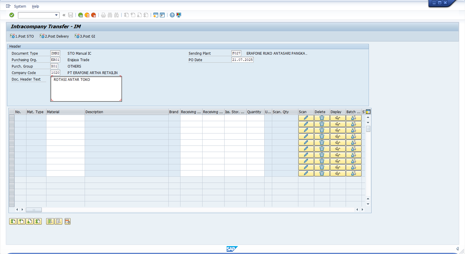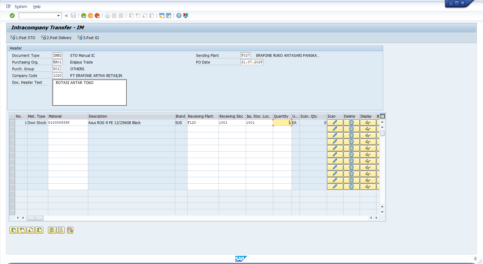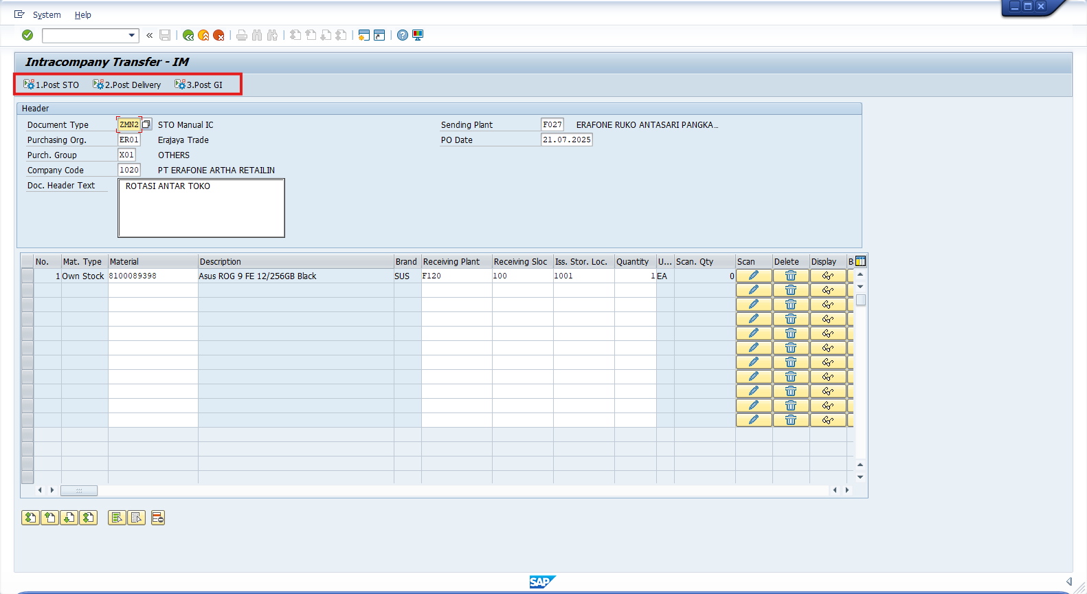 Tahap selanjutnya jika sudah sesuai silahkan tekan dengan berurutan untuk 1. Post STO -> 2. Post Delivery -> 3. Post GI.