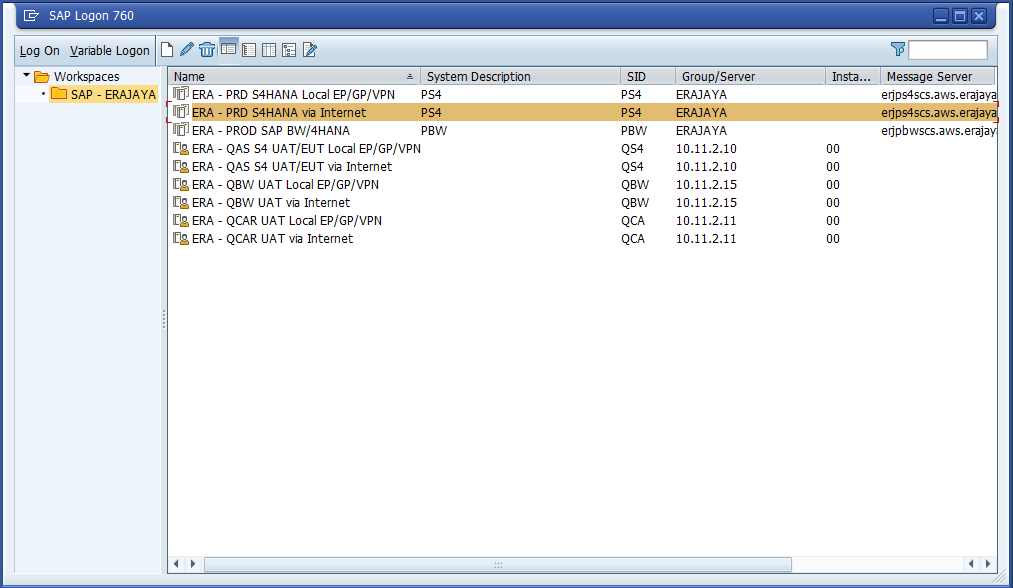1. Silakan buka SAP Dengan memilih ERA - PRD S4HANA via Internet